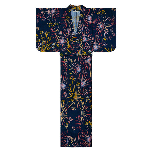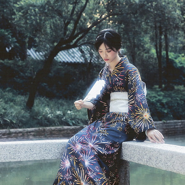 Discover a unique piece that combines elegance and character with this Japanese kimono for women, adorned with dazzling fireworks motifs on a deep black background. Its long, flowing cut paired with a white obi evokes summer festivities and the illuminated nights of Japanese matsuri. Crafted from a soft and comfortable fabric, it will add a refined and festive touch to any occasion, from casual outings to special events.